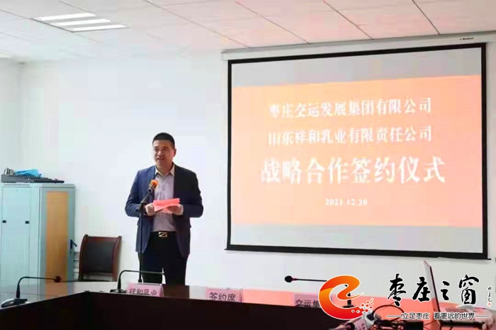 時近元旦,一元復始,萬象更新。12月20下午,山東祥和乳業(yè)有限責任公司與棗莊交運集團戰(zhàn)略合作框架協(xié)議簽約儀式在棗莊交運集團三樓會議室舉行。市國資委黨委委員、副主任孫晉卓,祥和乳業(yè)董事長闞久剛,棗莊交運集團黨委書記、董事長王賀龍出席簽約儀式并分別做了發(fā)言。